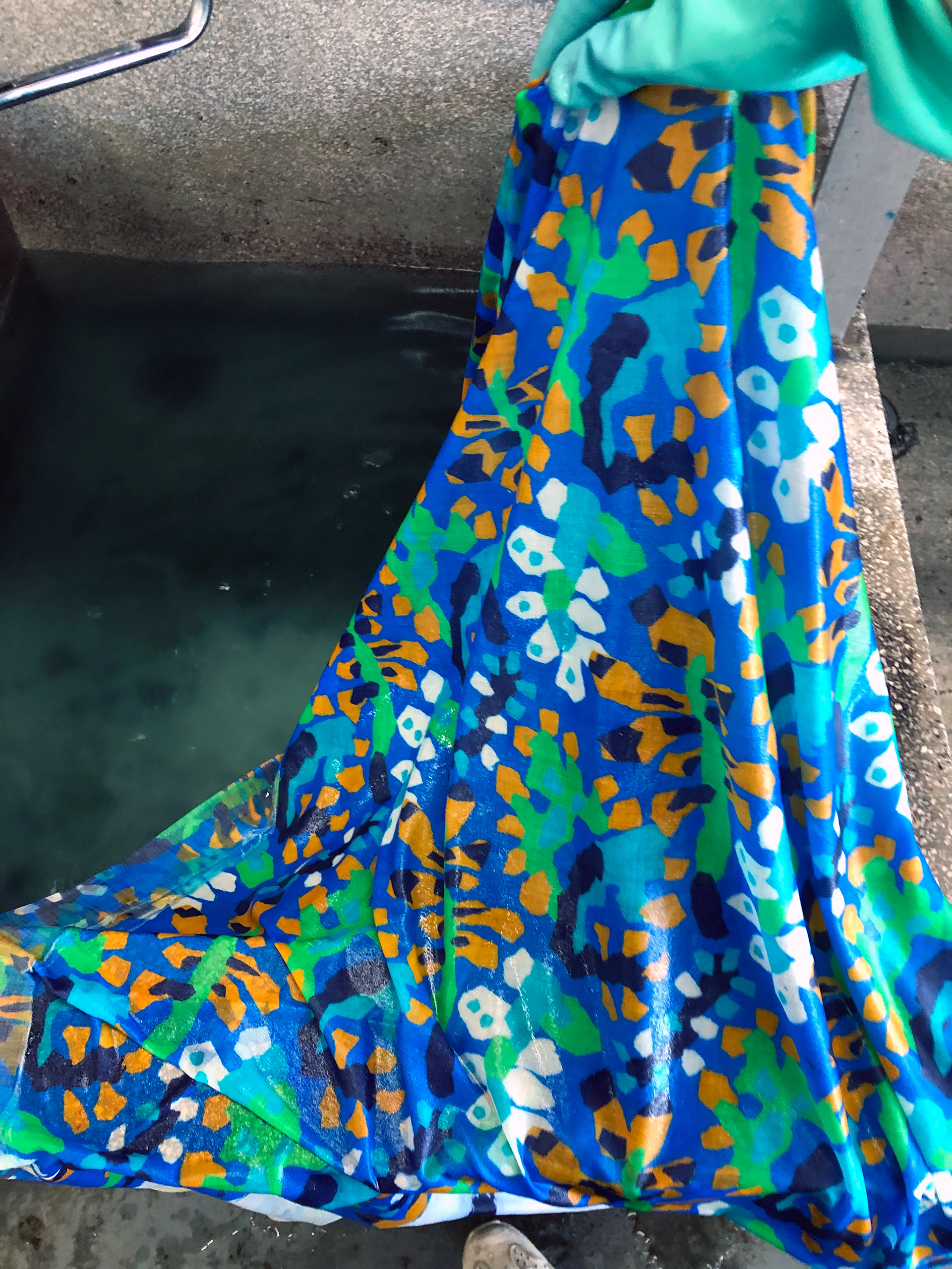 Joshibin yliopistossa Japanissa värjäyskurssille suunnittelemani kuosi. Tehtävänantona oli suunnitella kuusivärinen kasvinlehteä esittävä kangas. Värjäys on tehty perinteisellä japanilaisella estopastamenetelmällä kaavion avulla.