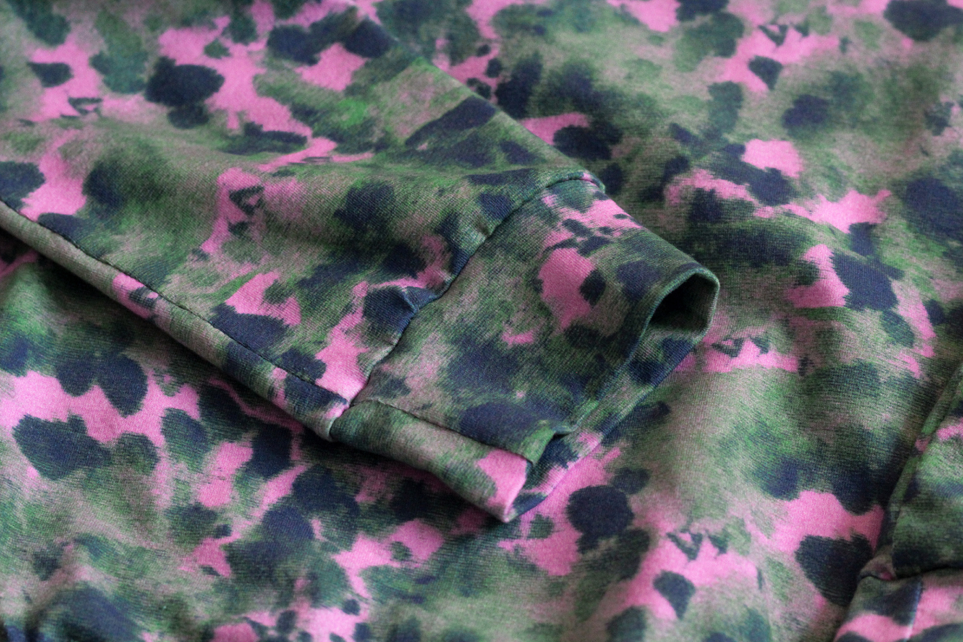 Tämä henkilökohtainen sivuprojekti syntyi puolivahingossa, kun löysin erästä kurssia varten tekemäni mustavalkoluonnokset ja kokeilin, miten saisin rakennettua niistä abstrakteja kuoseja. Alkuperäinen tekstuuri oli luotu musteella ja saippualla valkoiselle A5-kokoiselle lakananpalalle. Yksinkertainen luonnos sai digitalisoituna, raporttiin tuotuna ja väritettynä sähäkän uuden ilmeen, ja halusin ehdottomasti teettää kuosista itselleni jotakin.
